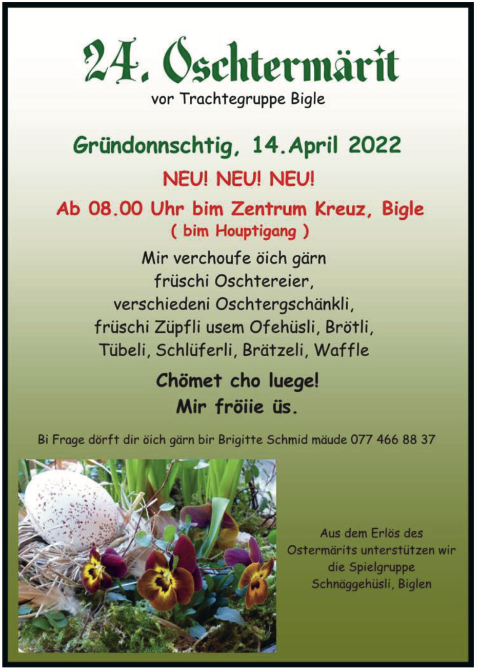 Am Gründonnerstag, 14. April ab 8.00 Uhr verkauft die Trachtengruppe beim Zentrum Kreuz in Biglen frische Ostereier, Zopf, Ostergeschenke, Schlüüferli, Brot aus dem Holzofen und weitere Köstlichkeiten.
